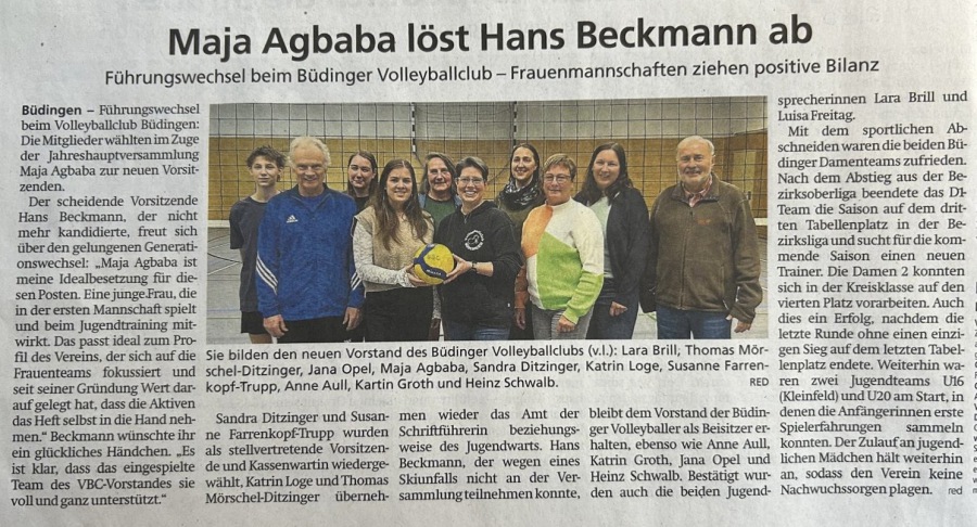 Büdingen (hjb) Mit fast unverändertem Vorstandsteam geht der Volleyball-Club Büdingen in die nächsten zwei Jahre. Bei der turnusgemäßen Mitgliederversammlung, die wie üblich in der Sporthalle stattfand, wurden die meisten Vorstandsmitglieder wieder in ihre Ämter gewählt. Lediglich Liv Aull schied wegen studienbedingter Abwesenheit (temporär) als Beisitzerin aus, für sie rückte Jana Opel nach.